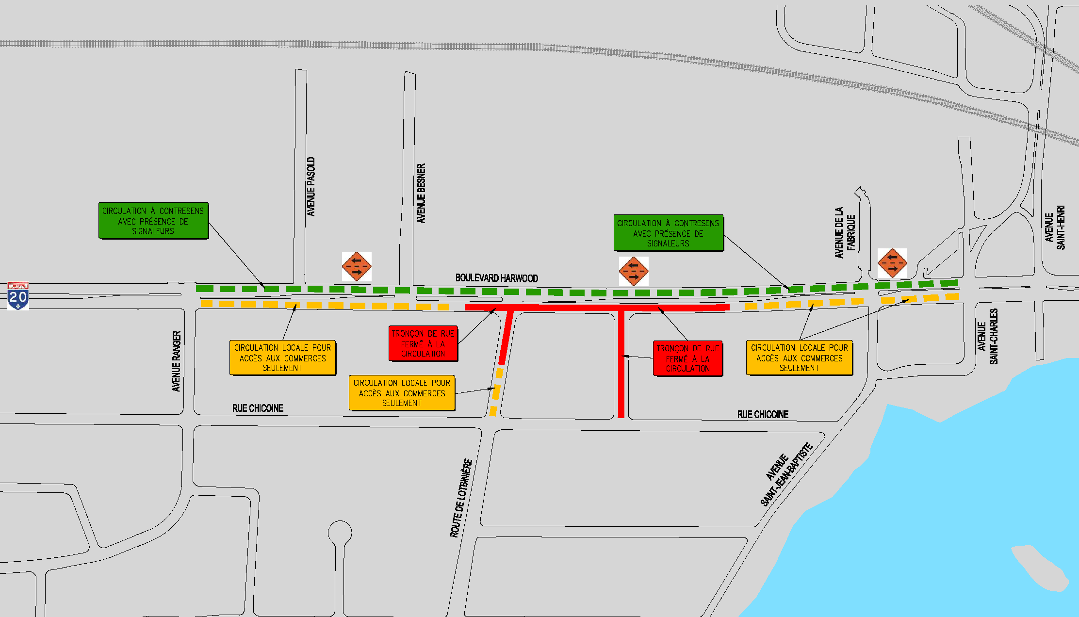 - Fermeture complète de la route 340 (boulevard de la Cité-des-Jeunes) entre la route Harwood et le chemin de la Petite Rivière.