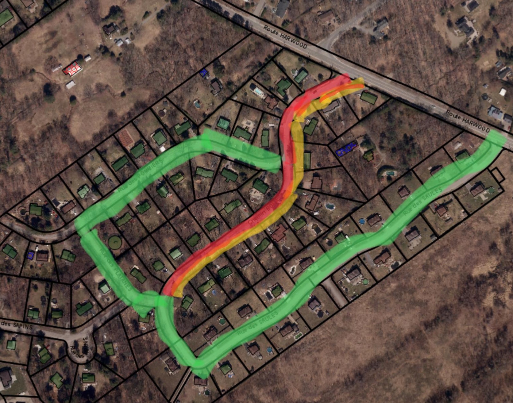 - Détour par la montée Labossière, la route Harwood et le chemin de la Petite Rivière.